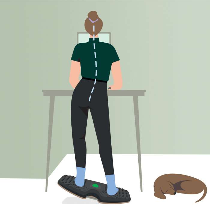 Podporuje aktivní držení těla, posiluje střed těla a pomáhá snižovat únavu při dlouhém stání