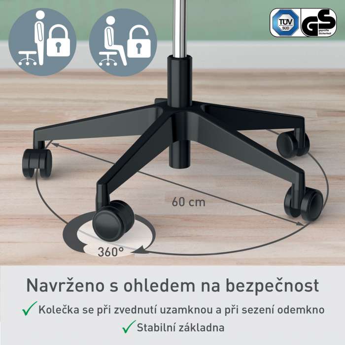 Kolečka židle jsou určena pro všechny typy podlah a jsou bržděná (točí se jen při zatížení židle)
