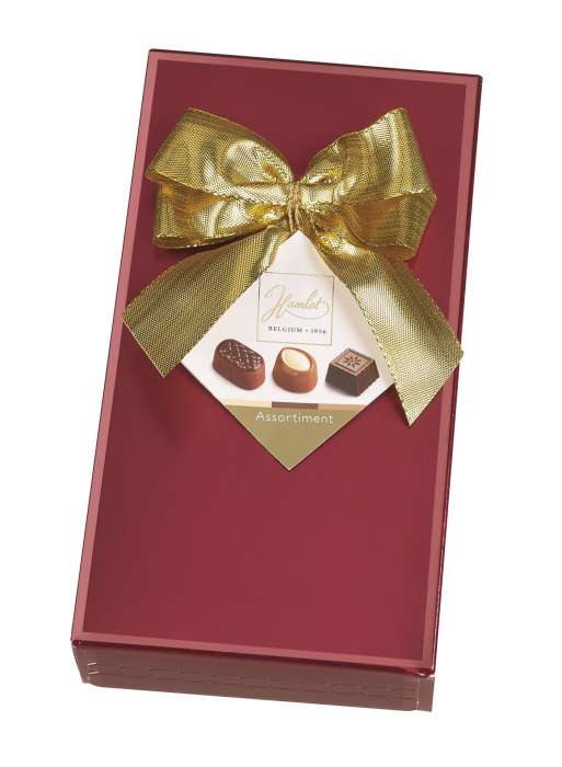 Elegantní belgické pralinky v dárkovém vínovém obalu se zlatou mašlí