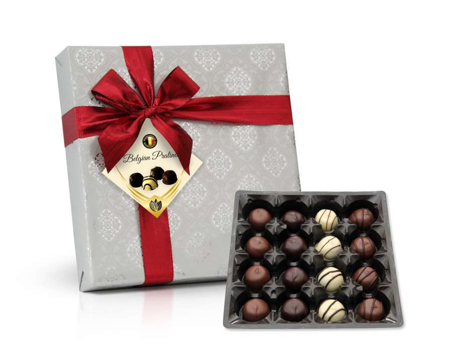 Bonboniéra obsahuje výběr kvalitních plněných belgických pralinek z mléčné, hořké a bílé čokolády.