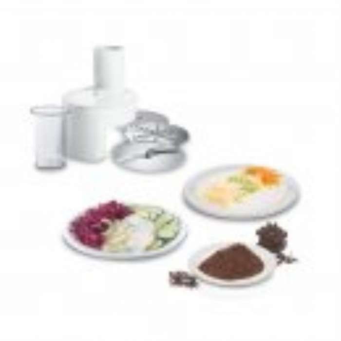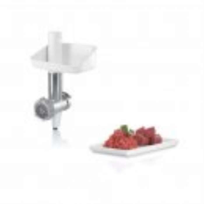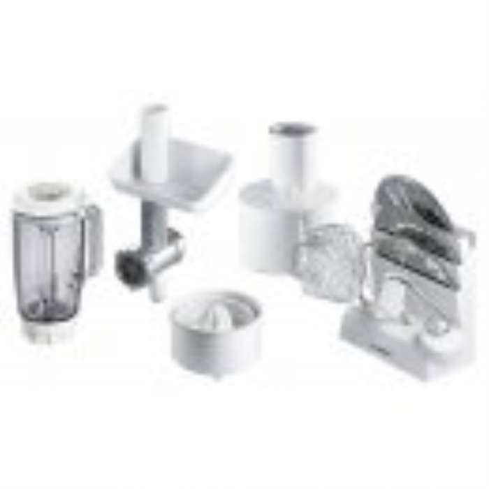 1 x víko, 1 x průběhový kotouč, 1 x plnicí pomůcka, 1 x mlýnek na maso, 1 x kovové hnětací háky, 1 x míchací mísa, 1 x umělohmotný mixér, 1 x strouhací kotouč, 1 x kotouč na jemné strouhání, 1 x míchací / šlehací metla, 1 x krájecí kotouč, 1 x pěchovátko, 1 x držák příslušenst.