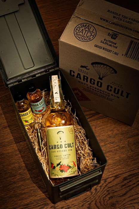 Box obsahuje: Cargo Cult Spiced Rum (0,7 l), miniatura Cargo Cult Banana Spiced Rum, miniatura Cargo Cult Navy Strength Rum, kovový otvírák vetvaru náboje, originální použitá muniční bedna