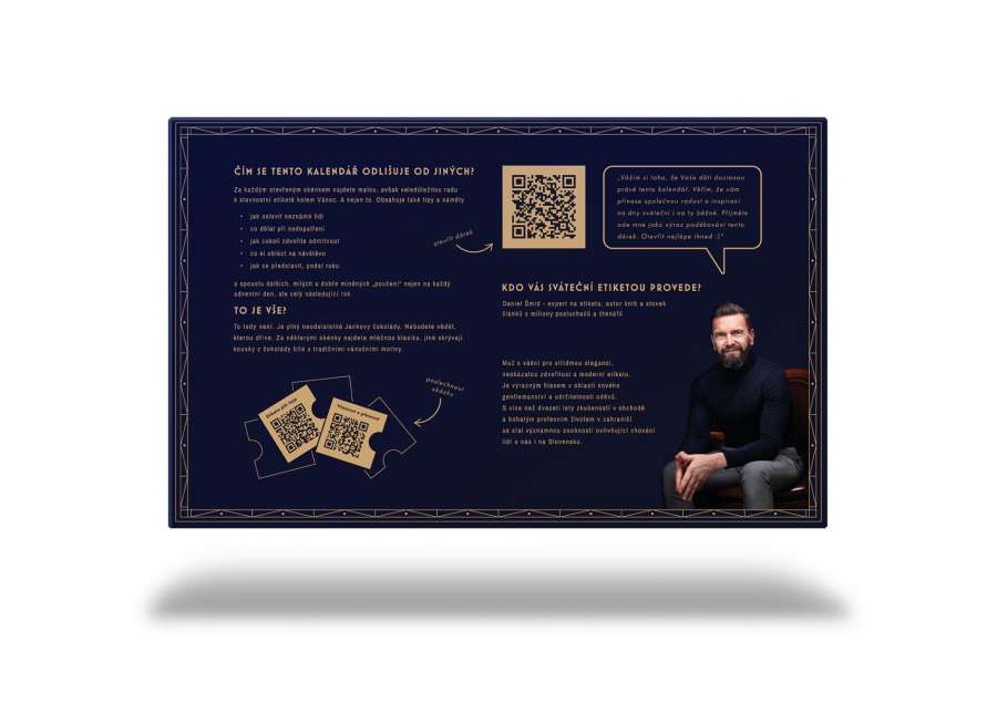 Digitální bonus navíc: Každé okénko obsahuje QR kód s praktickou radou pro slavnostní chování použitelnou nejen o Vánocích, ale celý rok