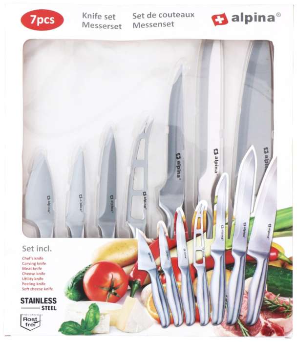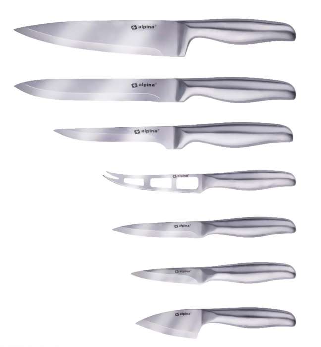 • Tato sada nožů alpina obsahuje 7 různých nožů, včetně kuchařského nože, nože na maso, nože na sýr a krájecího nože.