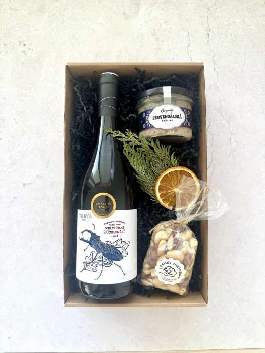 Sada obsahuje: víno Veltlínské zelené, Provensálská paštika, oříšky
