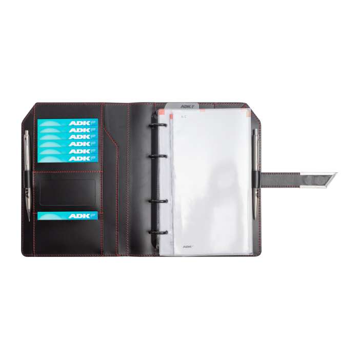Diář obsahuje týdenní plánování, plánovací kalendář, poznámkové listy, pravítko, obal na vizitky, kuličkovou tužku a mikrotužku ADK