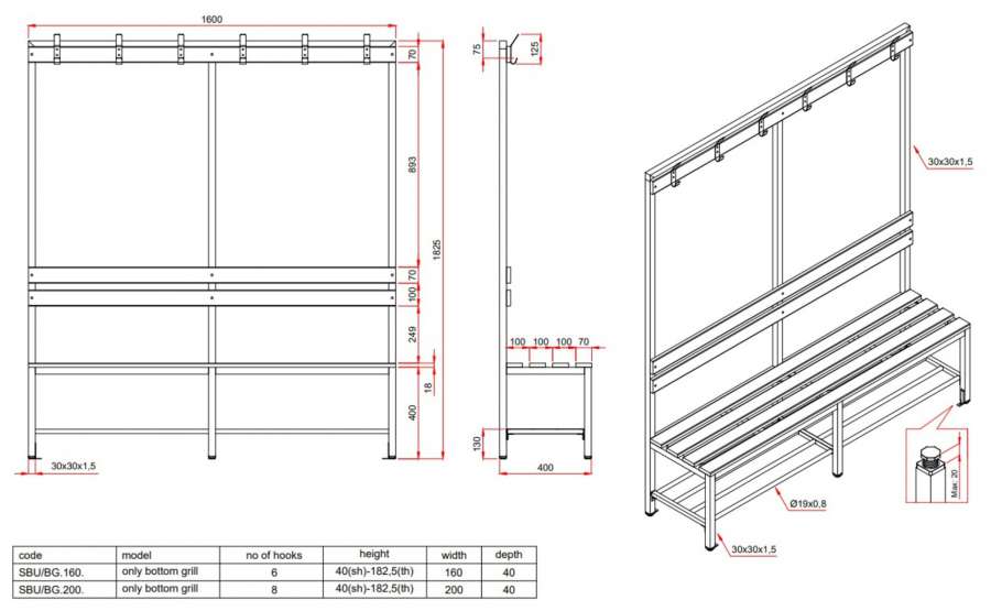 Jednostranná šatní lavice s opěradlem a 6 háčky vhodná ke zdi i do prostoru