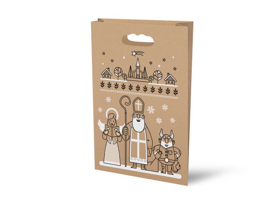 Dárková papírová taška s průhmatem a černobílým potiskem Mikuláše, anděla a čerta