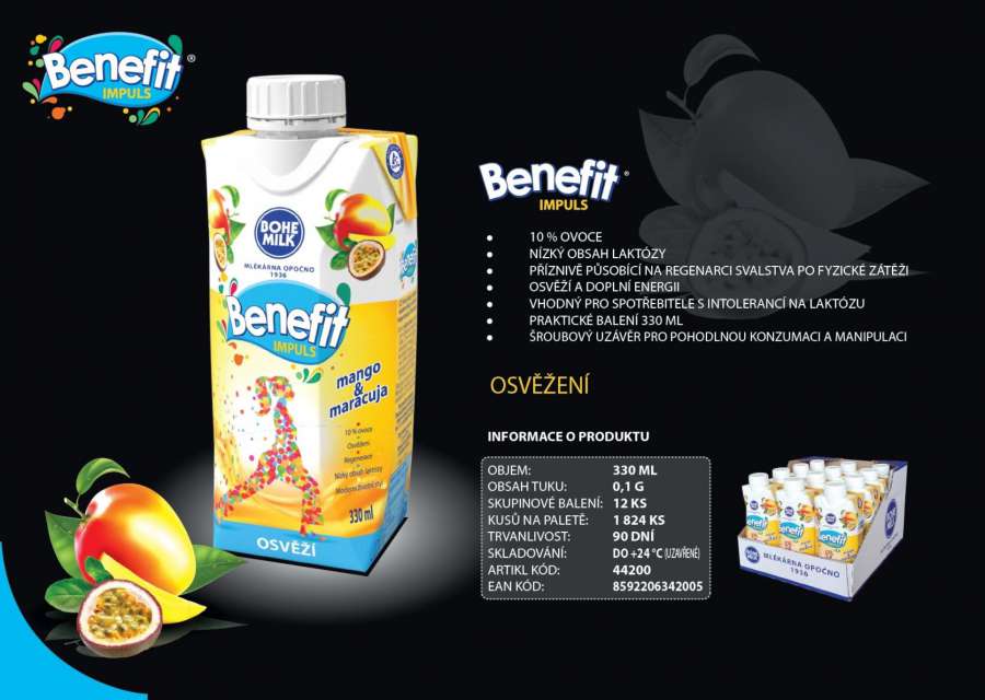 • Ovocný nápoj BENEFIT Impuls (10 % ovoce) s nízkým obsahem laktózy a s příchutí mango a maracuja, příznivě působí na regeneraci svalstva po fyzické zátěži, osvěží a doplní energii