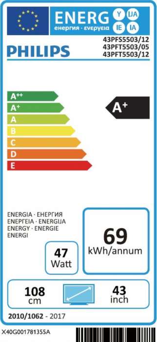 Displej: LED Full HD Rozlišení panelu 1920x1080p Poměr stran: 16:9 Úhlopříčka obrazovky (palce): 43 palců Počet připojení HDMI: 3 Počet portů USB: 2 Napájení ze sítě Střídavý proud 220 – 240 +/- 10 % Šířka přístroje: 970,6 mm Výška přístroje: 563,0 mm Hloubka přístroje: 805 mm Šířka přístroje (s podstavcem): 970,6 mm Výška přístroje (s podstavcem): 585,0 mm Hloubka přístroje (s podstavcem): 218,1 mm