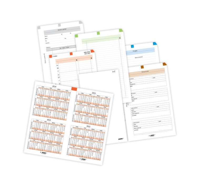 • Týdenní sada A6 obsahuje: diář, adresář A-Z, plánovací kalendář, týdenní plán pravý, roční plán, nezapomeň, týdenní rozvrh, roční rozvrh, klíčové oblasti, telefonní seznam, poznámkové listy