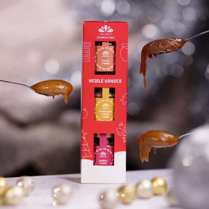 • Obsahuje trojici vynikajících ochucených medů rozmanitých chutí, vůní a barev: med se skořicí (75 g), med s perníčkovým kořením (75 g), med s kakaem (75 g)