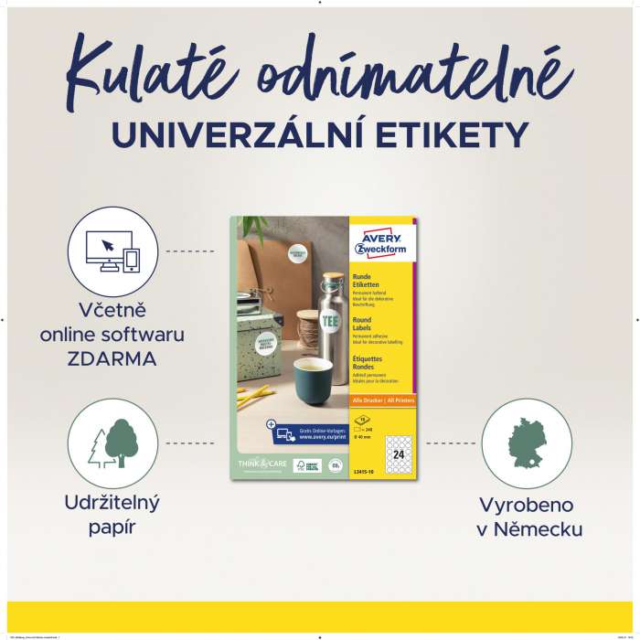 • Snímatelné kulaté etikety Avery Zweckform bílé barvy jsou ideální pro jakékoliv krátkodobé označování výrobků a propagačních předmětů