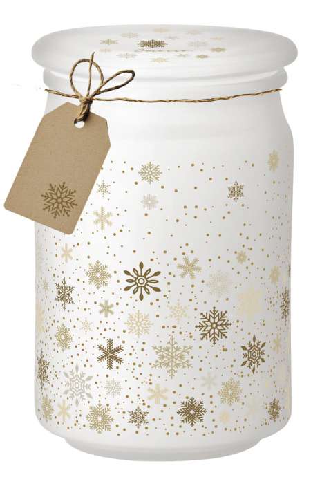 Svíčka se skleněným víčkem, Magic Snow, bílo-zlatá
