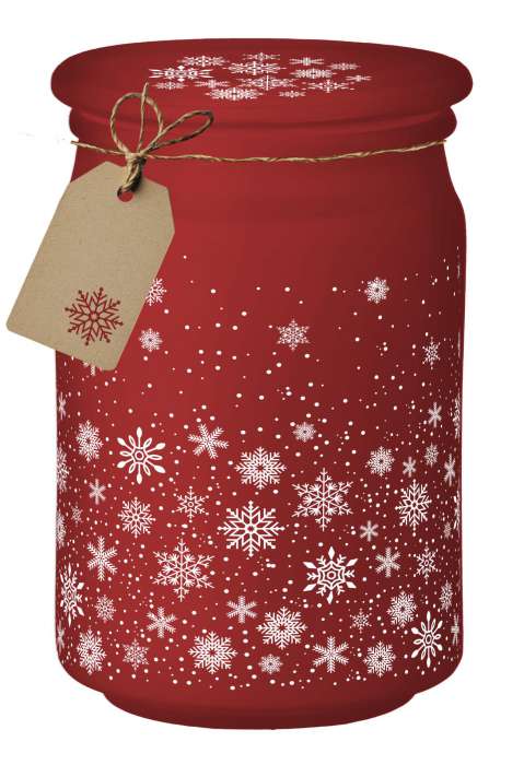 Svíčka se skleněným víčkem, Magic Snow, červeno-bílá