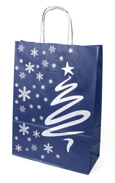Modrá dárková taška s motivem bílého stromečku a hvězd